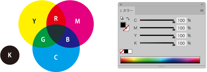 CMYKカラーとは、色の三原色である「C(シアン)」、「M(マゼンタ)」、「Y(イエロー)」に「K(ブラック)」インクを加えたものです。これらは混合すると色が暗くなっていく傾向があります。