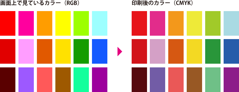 ただし、RGBはCMYKよりも表現できる色数が多く、CMYKに変換するとパソコンの画面上の表現通りの再現ができず、色がくすんでしまう場合があります。