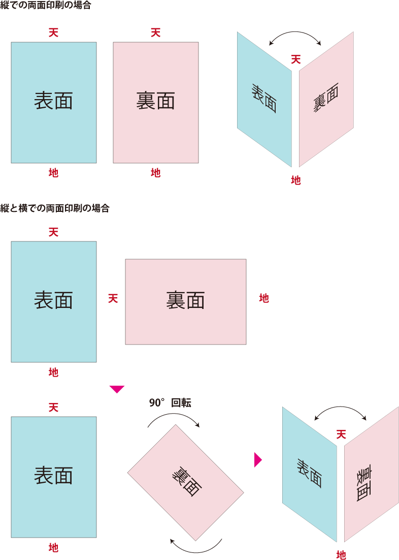 両面印刷の場合には、チラシの天・地(上下)の指示が必要です。通常、特に指示がなければ、デザインデータ(入稿データ)の上を天として印刷します。片面だけの印刷の場合は、天・地の指示は必要ありません。