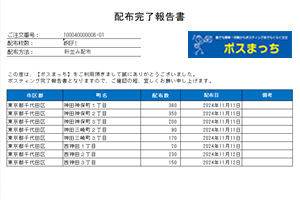 ポスティング完了後は、報告メールとあわせて「配布完了報告書」もお送りします。報告書には「配布日」・「配布エリア」・「配布枚数」を記載しております。